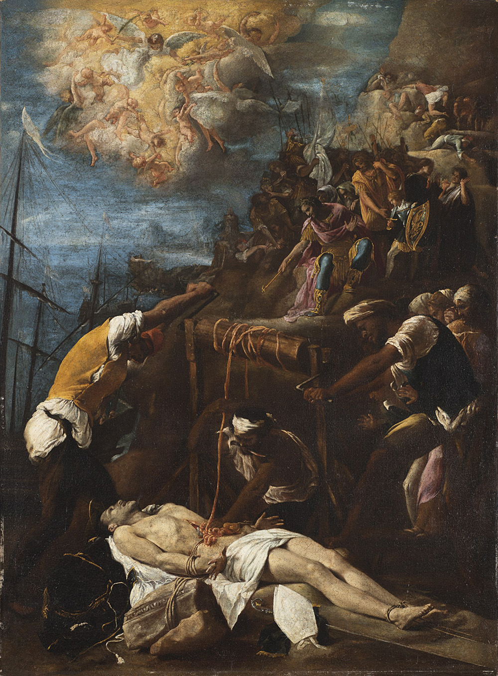 Borgianni Orazio (Roma 1578 - Roma 1616) "Martirio di Sant'Erasmo" olio su tela (cm 131x97) In cornice Allegata expertise del Dott. Gianni Papi Pubblicazioni: Juan de Lezcano and a íMartyrdom of St Lawrenceí at Roncesvalles In: "The Burlington magazine", 140, Gennaio 1998, pp. 5-15. Orazio Borgianni (1578-1616) "The martyrdom of Saint Erasmo" oil on canvas (cm 131x97) Framed
