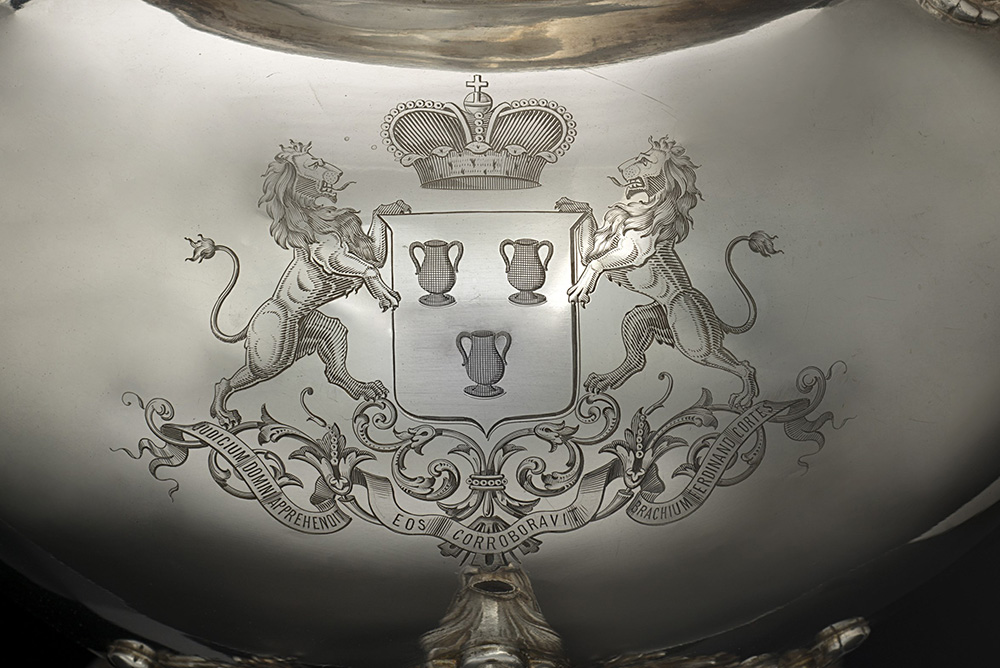 Importante servizio da tË e caffË in argento composto da un imponente samovar, caffettiera, teiera, zuccheriera, lattiera e dodici reggibicchieri, completi di bicchieri in vetro. Corpi di forma bombata decorati da incisioni e rilievi a motivi floreali e stilizzati, volute fogliate, mascheroni, applicazioni ad altorilievo di teste mulÏebri, e stemma inciso della famiglia Pignatelli con motto: "IUDICIUM DOMINI APPREHENDIT EOS CORROBORAVIT BRACHIUM FERDINAND CORTES"; in custodie originali. Francia, Parigi, 1852-79. Argentiere DÈsirÈ Mousset e marchio di Morel & C.ie (Samovar cm 54x48; Caffettiera h. cm 34) (gr 14950 ca.) (difetti e mancanza del rubinetto del samovar) An important silver tea and coffee set comprising an imposing samovar, a coffee pot, a tea pot, a sugar bowl, a milk jug and twelve glass holders with glasses. In original case.†France, Paris, 1852-79. Silversmith DÈsirÈ Mousset and mark of Morel & C.ie (Samovar cm 54x48; coffeepot h. cm 34) (gr 14950 ca.) (defects; samovar spigot lacking)