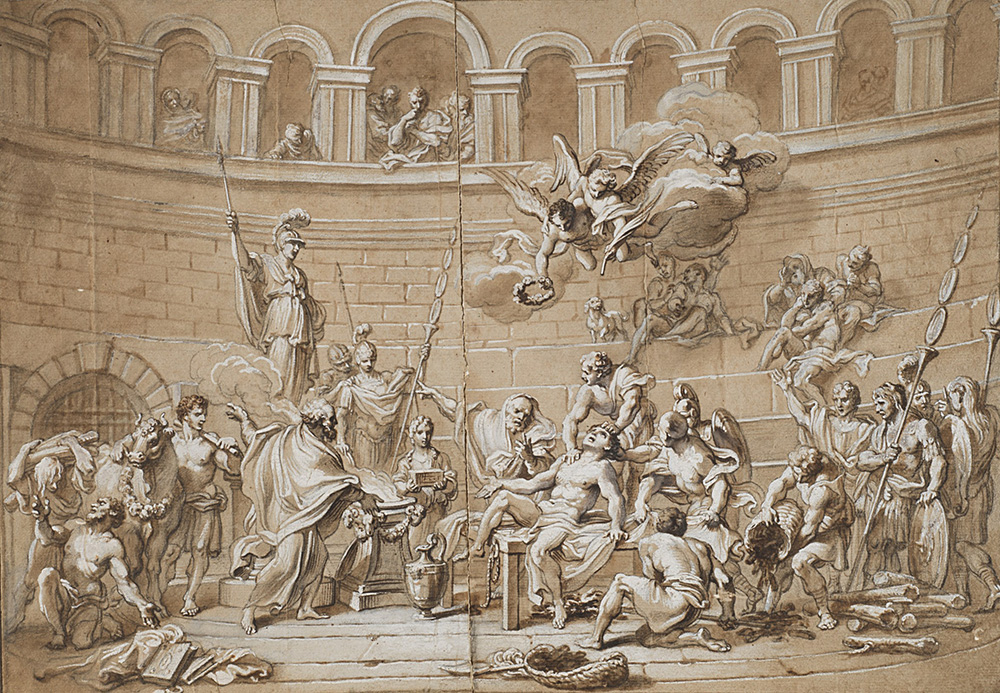 Antico disegno a matita, china e rilievi in biacca raffigurante una scena mitologica (cm 34x49), in cornice (difetti) Antique drawing (cm 34x49) pencil, china and white lead on paper. Framed (defects)