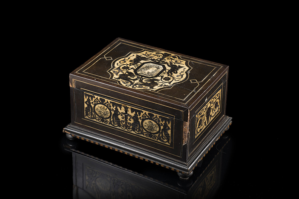 Scatola portagioie in legno ebanizzato intarsiata sul coperchio in avorio a putti, volute e angelo e al centro ritratto di Raffaello. Fasce a raffaellesche e fiori. Piedi torniti. Bottega del Pogliaghi, Lombardia, sec. XIX (cm 26,5x14x17) (difetti e mancanze) An ivory marquetry and ebonised wood box. Workshop of Pogliaghi, Lombardy, 19th century (cm 26,5x14x17) (defects and losses)