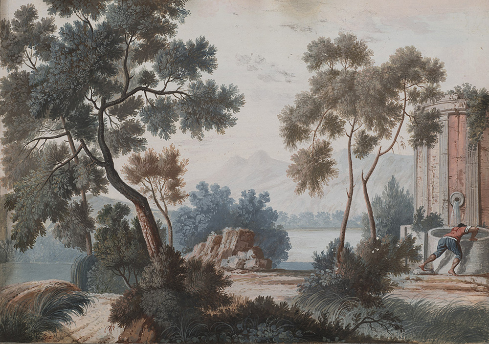 Maestro del secolo XVIII "Paesaggio fluviale con figure alla fontana" gouache...