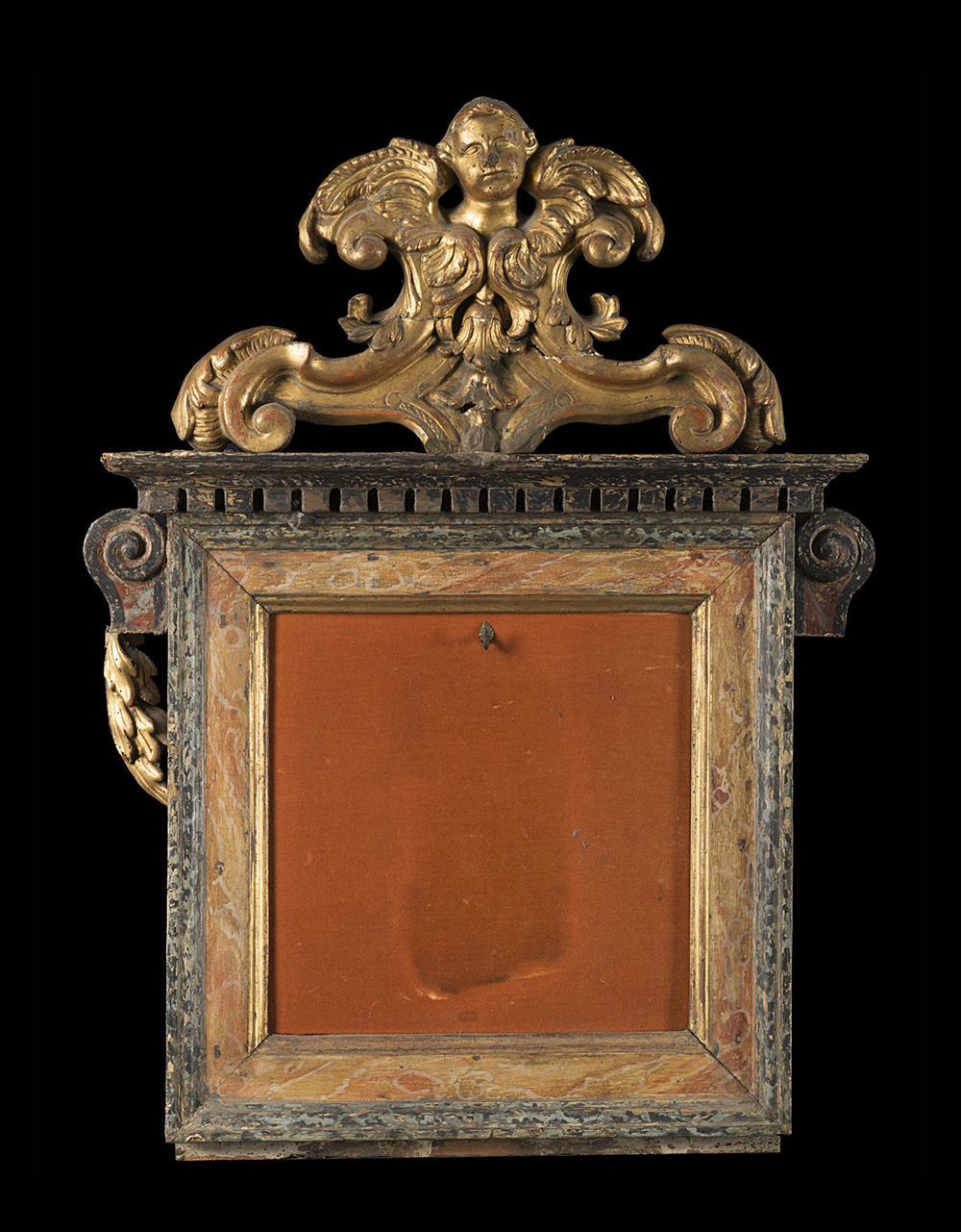 Arte del sec. XVII. Cornice di forma architettonica in legno laccato, decorato ai lati e nella cimasa da fregi in legno scolpito a foglie e testa di cherubino (luce cm 30x30) (restauri e mancanze) 17th-century art. A lacquered giltwood frame (cm 30x30) (restorations and losses)