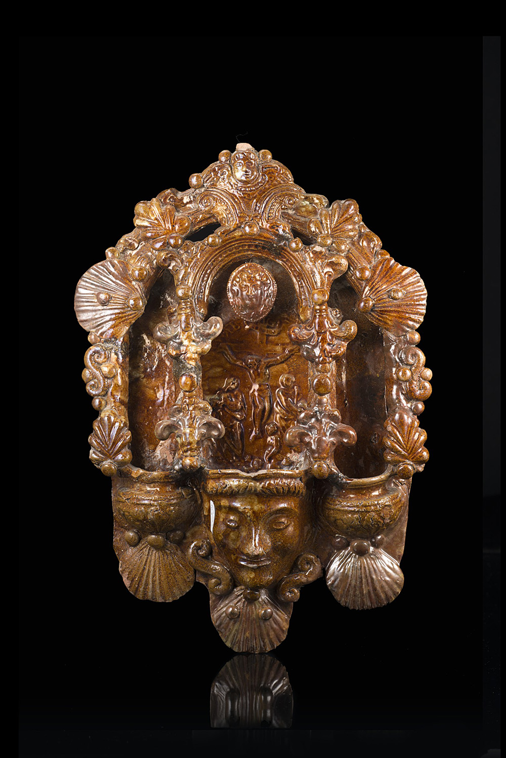 Acquasantiera in ceramica a forma di altarolo con decorazione plastica tardo barocca e conchiglie con immagini devozionali e Crocefisso. Il corpo ceramico Ë rivestito in bruno di manganese. Parte superiore cuspidata con motivo tardo barocco. Grottaglie, fine sec. XVIII/inizi sec. XIX (cm 40x30) (difetti) A ceramic holy water front. Grottaglie, late 18th/early 19th century (cm 40x30) (defects)