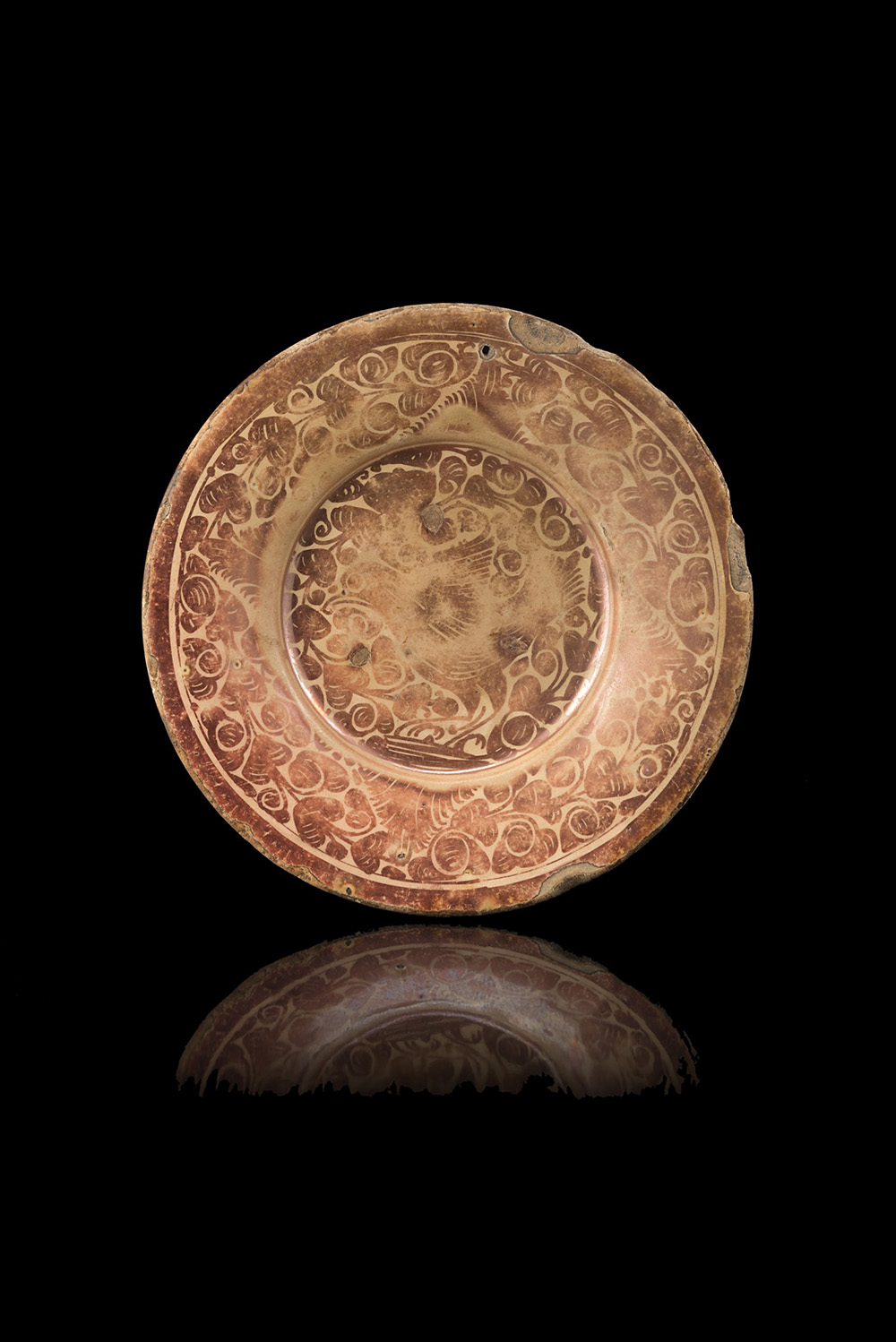 Arte ispano-moresca, sec. XVIII. Piattino tondo in terracotta decorata a lustro a volatile e motivi stilizzati nella bordura (d. cm 20,5) (difetti) Spanish-Moorish art, 18th century. A terracotta dish (d. cm 20,5) (defects)