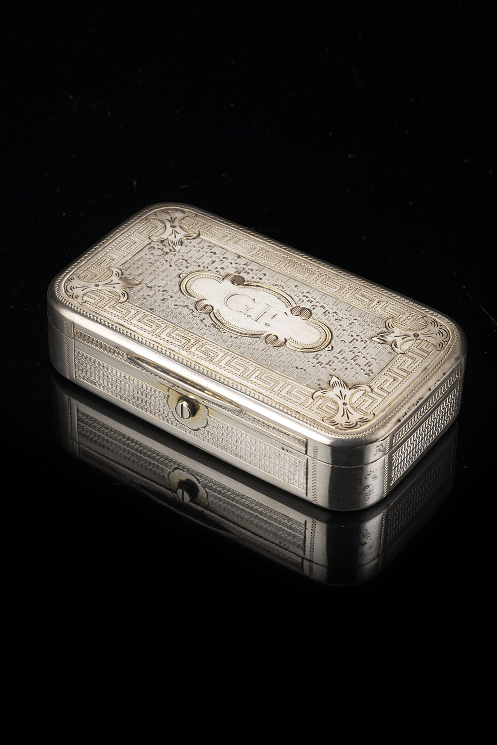 Tabacchiera in argento di forma rettangolare con superficie a guillochË ed...