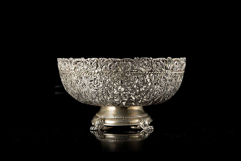 Alzata in argento di forma circolare con corpo traforato e sbalzato a motivi floreali ed architettonici; base liscia perlinata con quattro piedi ferini ad attacco fogliato. Milano, met‡ sec. XX. Argentiere Messulam (d. cm 23x h. 12 ca) (gr 1080 ca.) (difetti) A silver centrepiece. Milan, mid 20th century. Silversmith Messulam (d. cm 23x h. cm 12) (gr 1080 ca.) (defects)