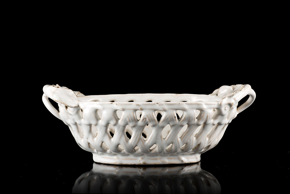 Cestino ovale traforato ad imitazione del vimini intrecciato in maiolica bianca. Manici a rametto. Sec. XVIII (cm 22 x 12,5) (sbeccature e mancanze) A majolica basket. 18th century (cm 22x12,5) (chipping and losses)