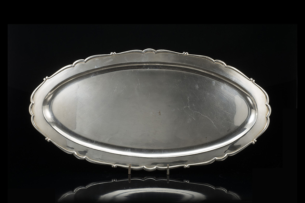 Vassoio in argento di forma ovale sagomata, liscio, con bordura a volute. Milano, sec. XX (cm 65,5x33 ca.) (gr 1820 ca.) (lievi difetti) An oval silver tray. Milan, 20th century (cm 65,5x33 ca.) (gr 1820 ca.) (minor defects)