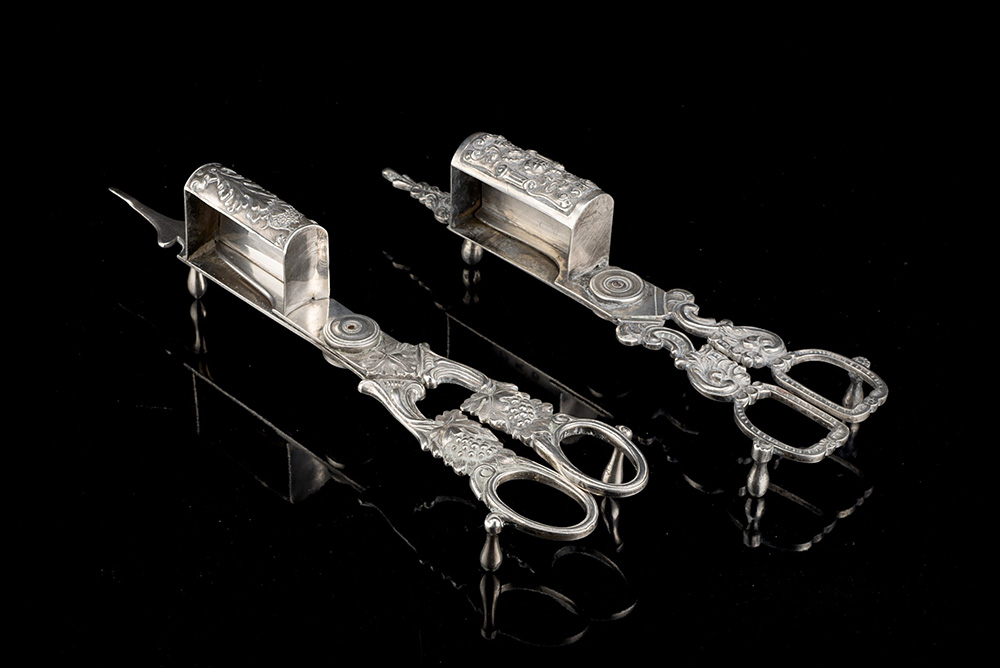 Due spegnimoccolo in argento decorati a volute e motivi vegetali. Argentiere Francesco Liverti e argentiere Tommaso Panizza. Regno lombardo-veneto. Milano, sec. XIX (l. max cm 20) (gr tot 230 ca.) (lievi difetti) A pair of silver snuffles. Silversmiths Francesco Liverti and Tommaso Panizza. Kingdom Lombardy-Venetia. Milan, 19th century (lungh. max cm 20) (gr tot 230 ca.) (minor defects)
