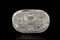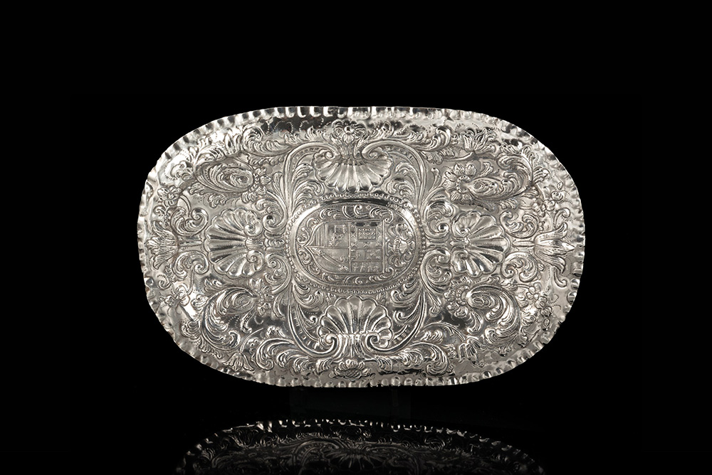 Vassoio in argento di forma ovale con centro convesso sbalzato con stemma...