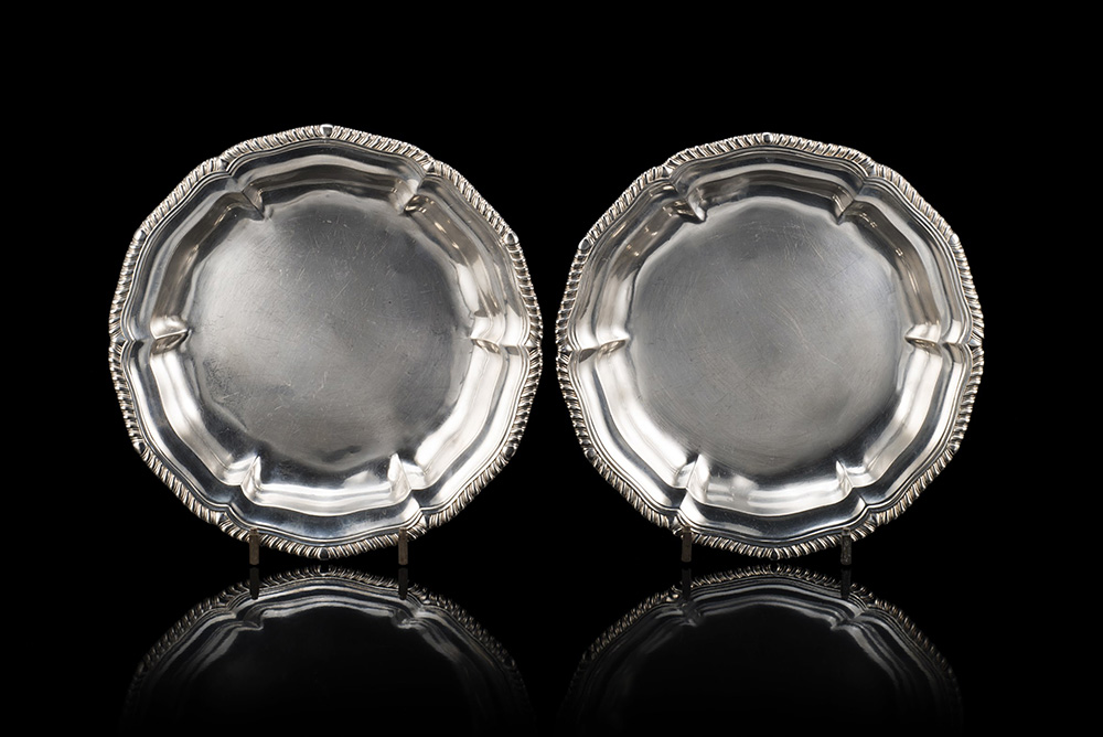 Coppia di piatti in argento di forma circolare con fondo liscio. Cavetto e...
