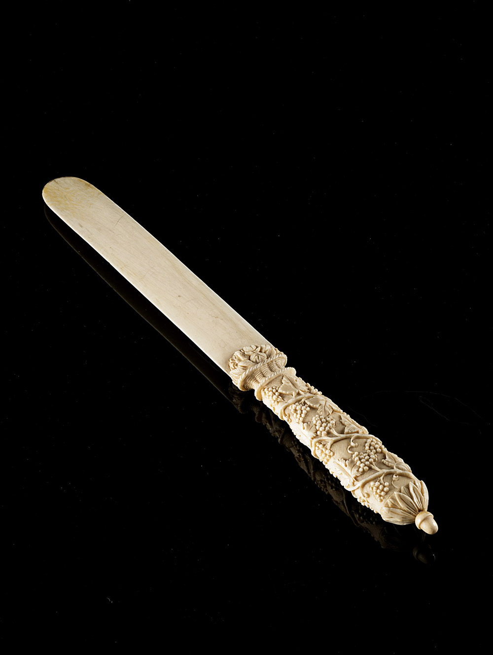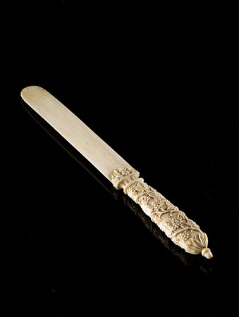Tagliacarte in avorio con presa intagliata a viti e trionfi floreali. Sec....
