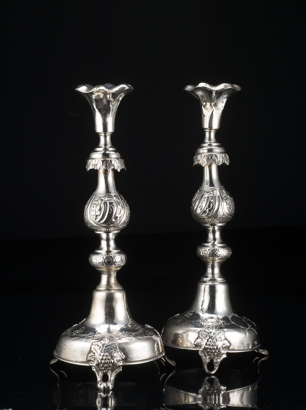 Coppia di candelieri di Shabb‡t in argento con base circolare tripode, fusto a rocchetto con nodo sferico e bobeche a campanula, decorati a volute e motivi floreali. Marcati Szkarlat. Ufficio di assaggio di Minsk 1894 (?) (gr 860 ca.) (h. cm 34) (difetti) A pair of silver shabbat candlesticks. Marked Szkarlat, Essay Office of Minsk 1894(?) (h cm 34) (gr 860 ca) (defects)