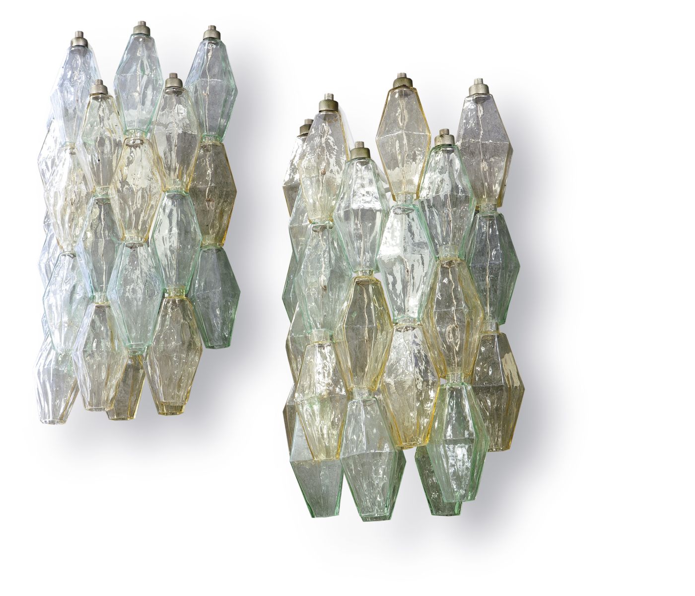 VENINI - Coppia di appliques serie poliedri. Vetro soffiato in due colori. H cm 46. Bibl.: Franco Deboni, "Venini Glass", volume I, Allemandi, 2007, pag 68. Anna Venini Diaz de Santillana (a cura di) "Venini catalogo ragionato 1921-1986", Skira, 2000, pag.22.