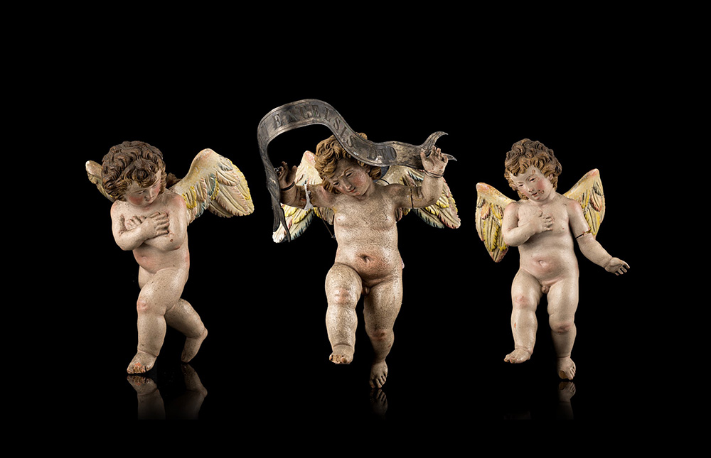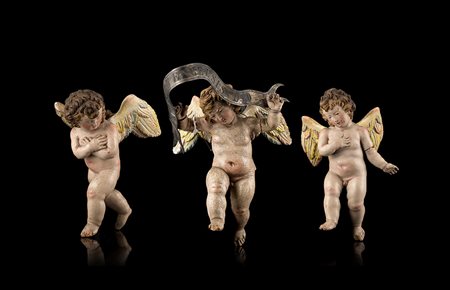 Arte napoletana del sec. XIX "Cherubini" tre sculture da presepe in legno dipinto (h. cm 14) (difetti e mancanze) Neapolitan art, 19th century. Three terracotta and wood figures representing cherubs (h. cm 14) (defects and losses)