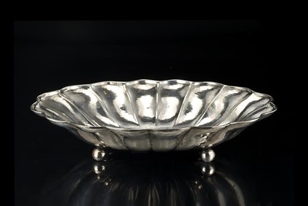 Centrotavola in argento di forma ovale sagomata, sbalzato con baccellature radiali; quattro piedini a sfera. Argentiere Miracoli. Milano, sec. XX (cm 34x35, h. cm 7) (gr 570 ca.) (lievi difetti) A silver centerpiece. Italy, 20th century, silversmith Miracoli (cm 34x35 h cm 7) (gr 570 ca) (minor defects)
