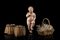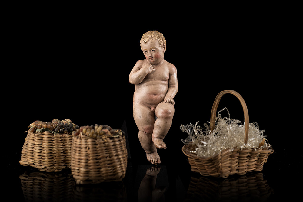 Arte napoletana "Bambinello" scultura da presepe in terracotta dipinta (h. cm 28) unita a tre cestini (difetti e felature) Neapolitan art. A terracotta and wood figure representing Infant Christ (h. cm 28) and three baskets (defects and cracks)