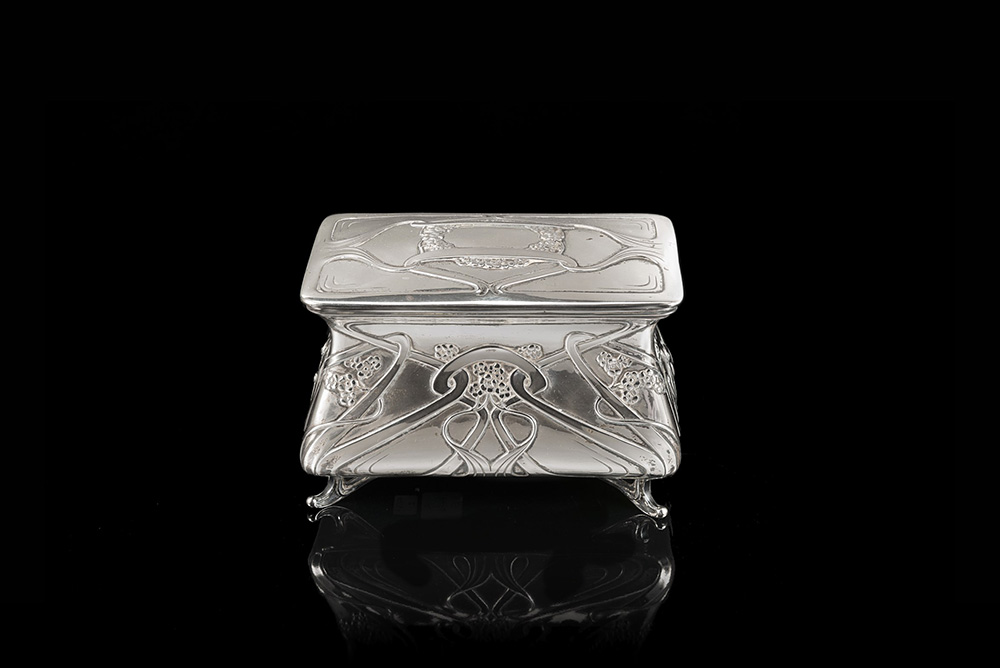 Scatola in argento di forma rettangolare bombata e rastremata, poggiante su...