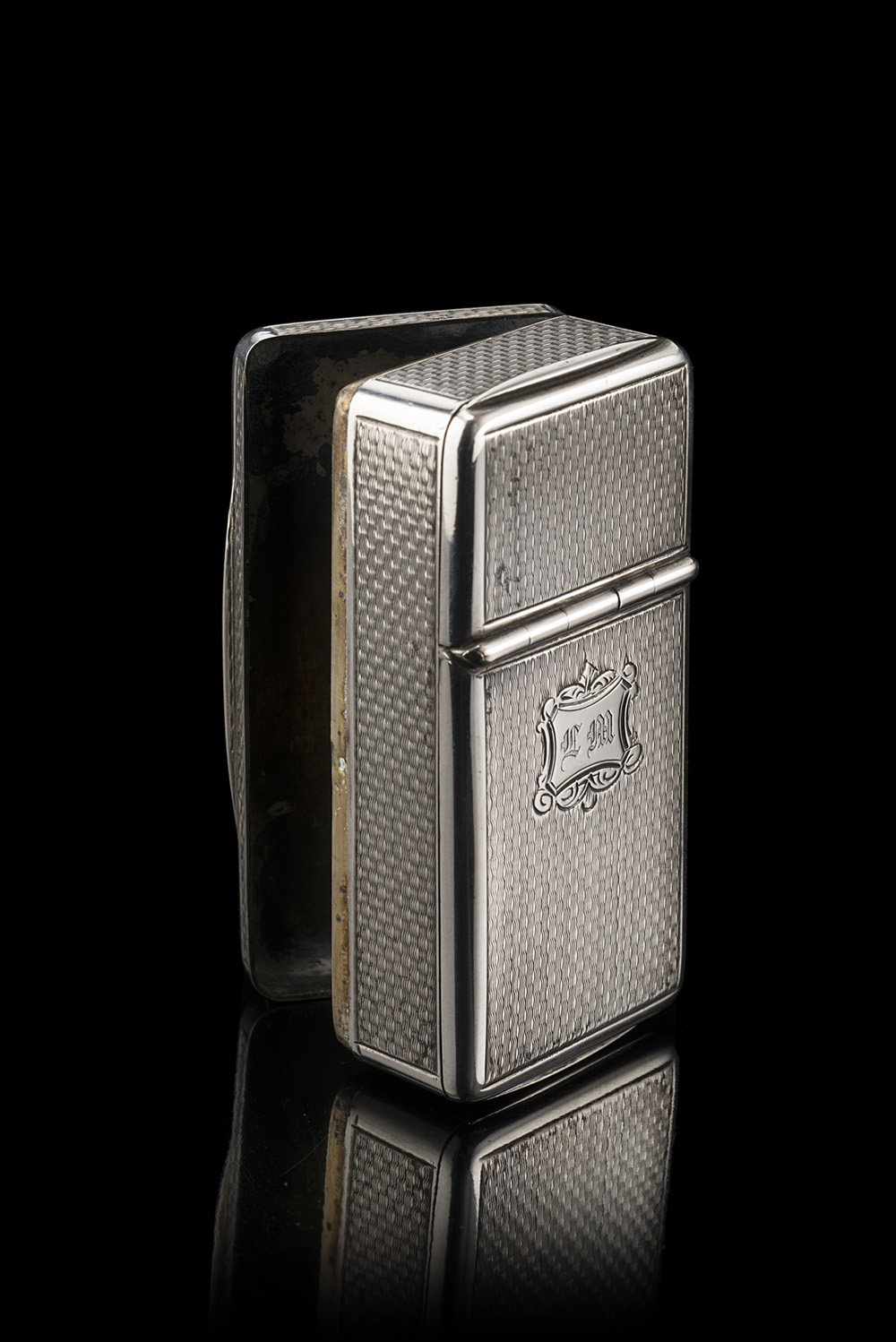 Portafiammiferi in argento di forma rettangolare a tre scomparti con superficie a guillochË e cartiglio con iniziali incise. Francia, fine sec. XIX (cm 6x3x1,5) (gr 50 ca.) (lievi difetti) A silver vesta case. France, end 19th century (cm 6x3x1,5) (gr 50 ca) (minor defects)