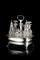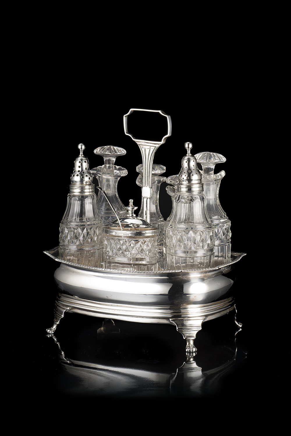 Cruet in argento di forma rettangolare bombata con orlo svasato mistilineo e presa squadrata, sorretto da quattro piedini a zampa e contenente sette flaconi in cristallo molato. Londra, 1818 (h. cm 24 ca.) (lievi difetti) A silver cruet with seven crystal bottles. London, 1818 (h. cm 24) (minor defects)