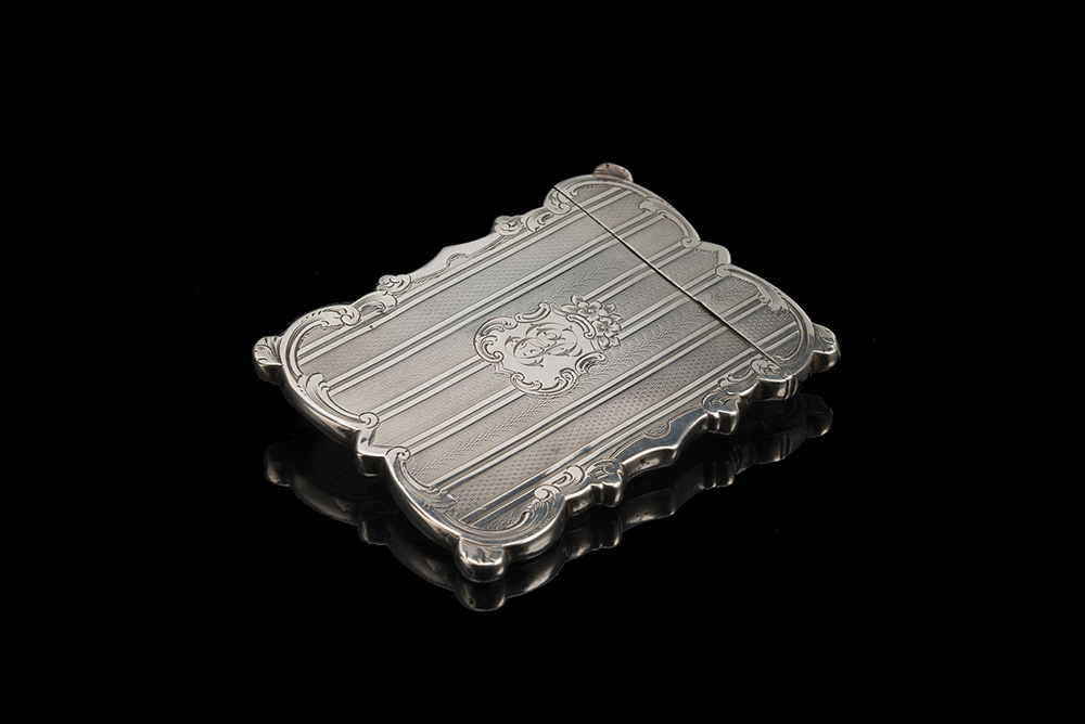 Portabiglietti in argento di forma rettangolare decorato a guillochÈ e volute con monogramma inciso. Birmingham, 1854. Argentiere Hilliard&Thomanson (cm 9,5x7) (gr 50 ca.) (difetti) A silver card case. Birmingham, 1854. Silversmith Hilliard & Thomanson (cm 9,5x7) (gr 50 ca) (defects)