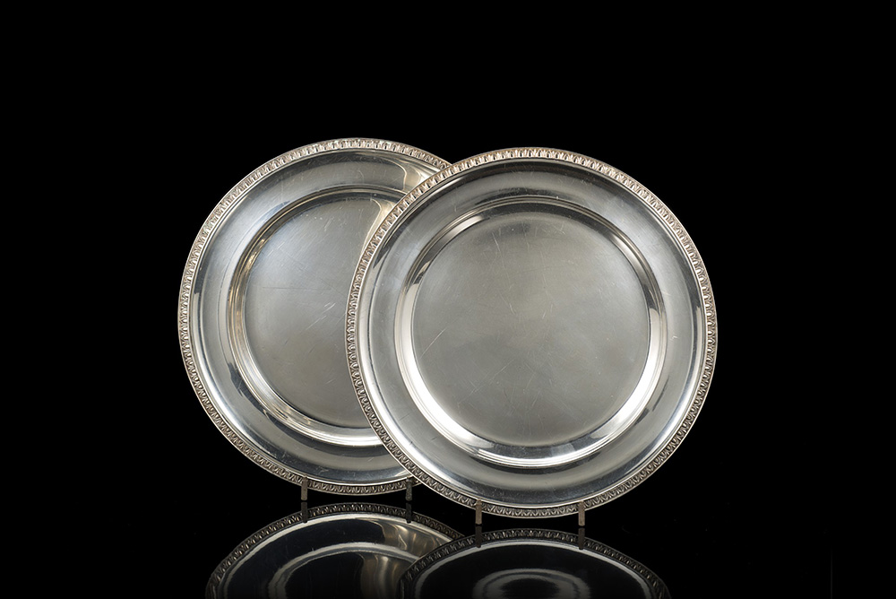Coppia di piatti in argento di forma circolare, lisci, con bordura decorata a palmette. Argentiere Frugoni. Italia, met‡ sec. XX (d. cm 35,5) (gr 1950 ca.) (difetti) A pair if silver plates. Italy, mid 20th century. Silversmith Frugoni (d cm 35,5) (gr 1950 ca) (defects)