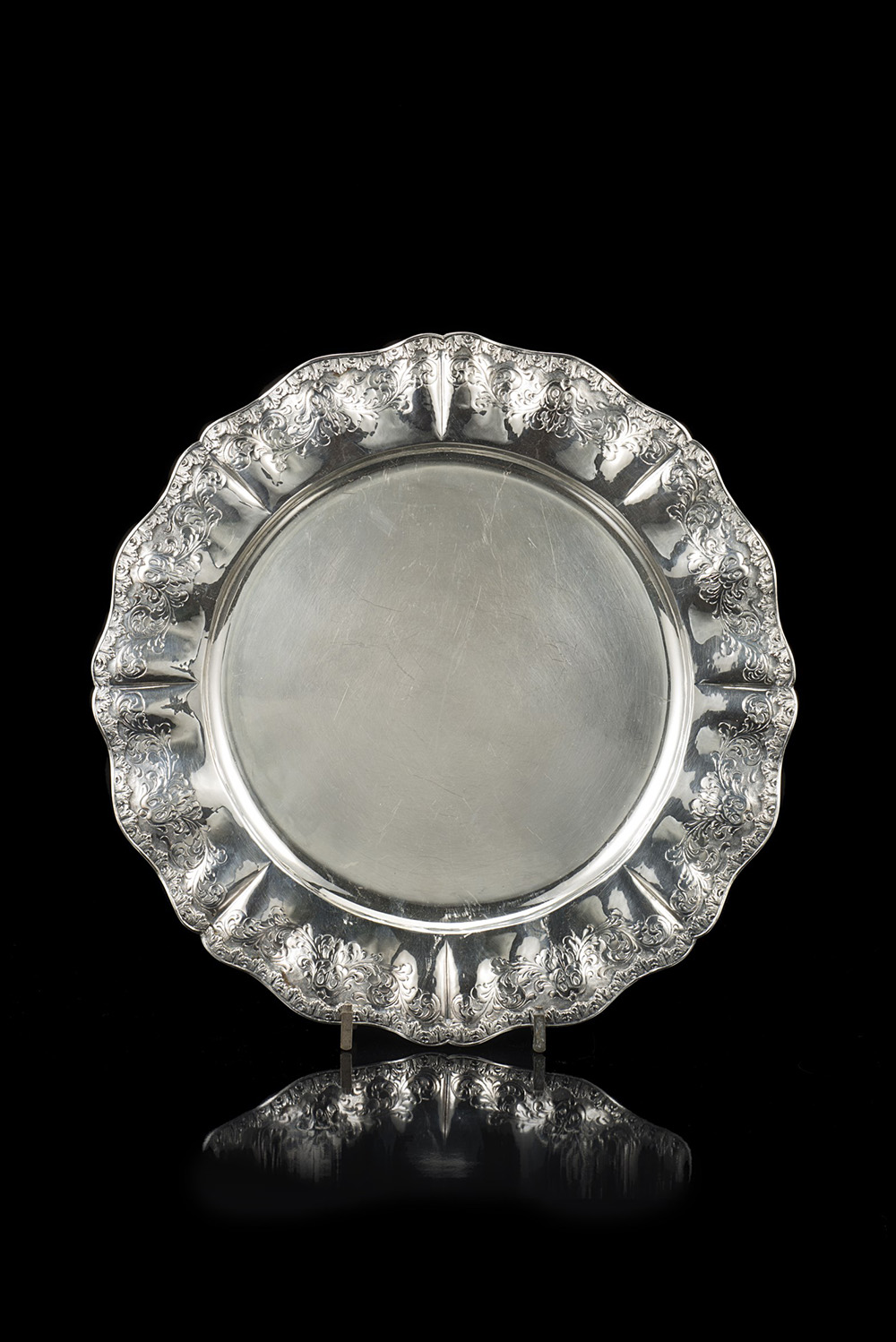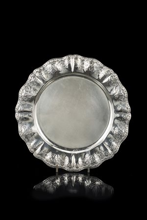 Piatto in argento di forma circolare sagomata con fondo liscio e tesa ondulata, decorata con motivi vegetali incisi e bordura a foglie d'acanto. Marchio del Fascio. Italia, anni 30/40 (d. cm 37,5) (gr 900 ca.) (lievi difetti) A silver plate. Italy, 1930s-40s. Fascio hallmark (d cm 37,5) (gr 900 ca) (minor defects)
