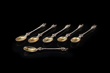 Sei cucchiaini in argento del tipo 'apostle spoons' con palette dorate. Germania, Hanau, sec. XIX. Argentiere J.D. Schleissner & Sˆhne (gr 410 ca.) Six silver apostle spoons Germany, Hanau 19th century. Silversmith, J.D Schleissner & Sohne (gr 410 ca)