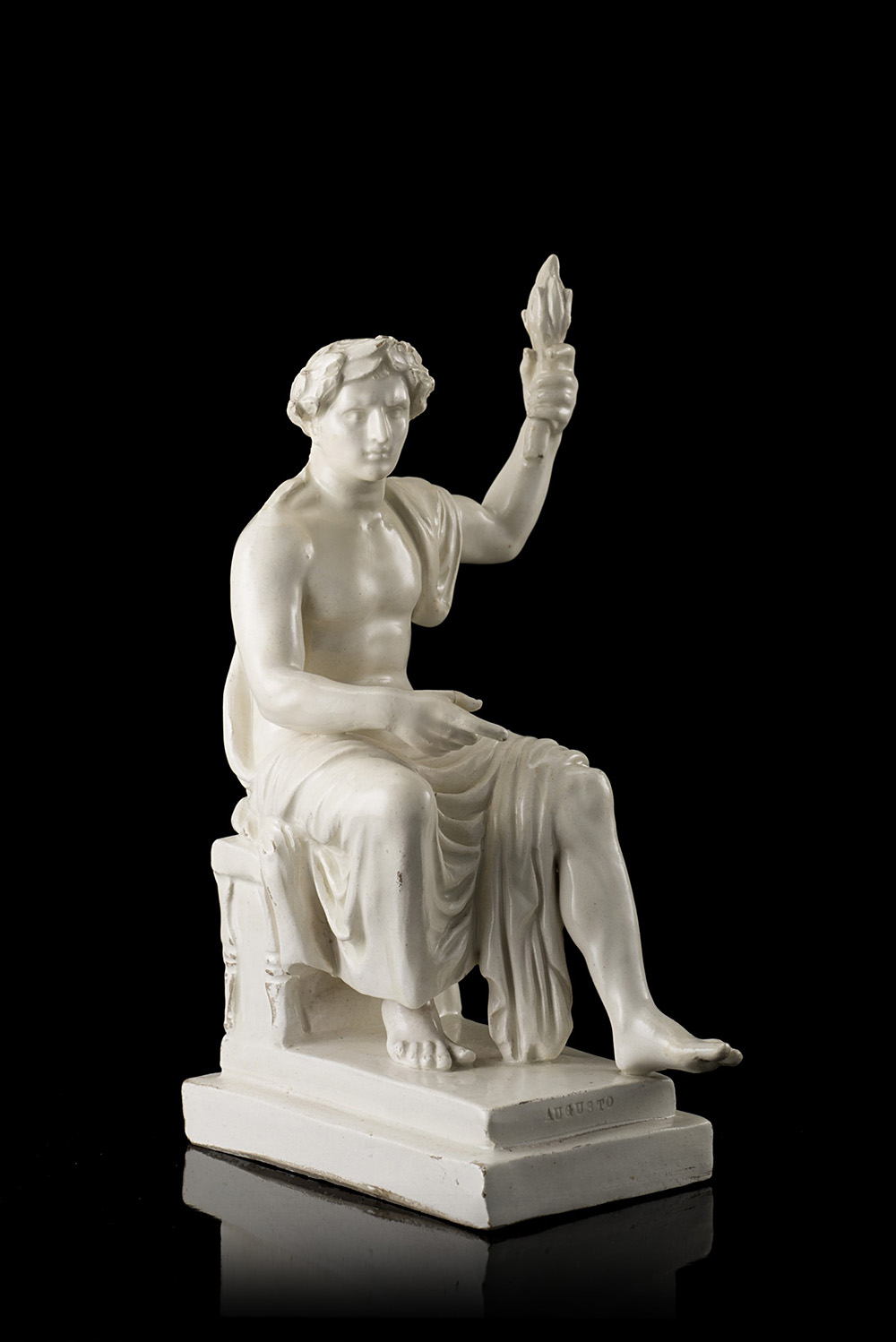 Manifattura Giustiniani, Napoli seconda met‡ del sec. XVIII. Figura in terraglia di Augusto, raffigurato seduto che regge una fiaccola nella mano sinistra. Su base rettangolare (h. cm 18,5) (difetti) Giustiniani manufacture, Naples, second half of the 18th century, earthenware figure of Augustus (h. cm 18,5) (defects)