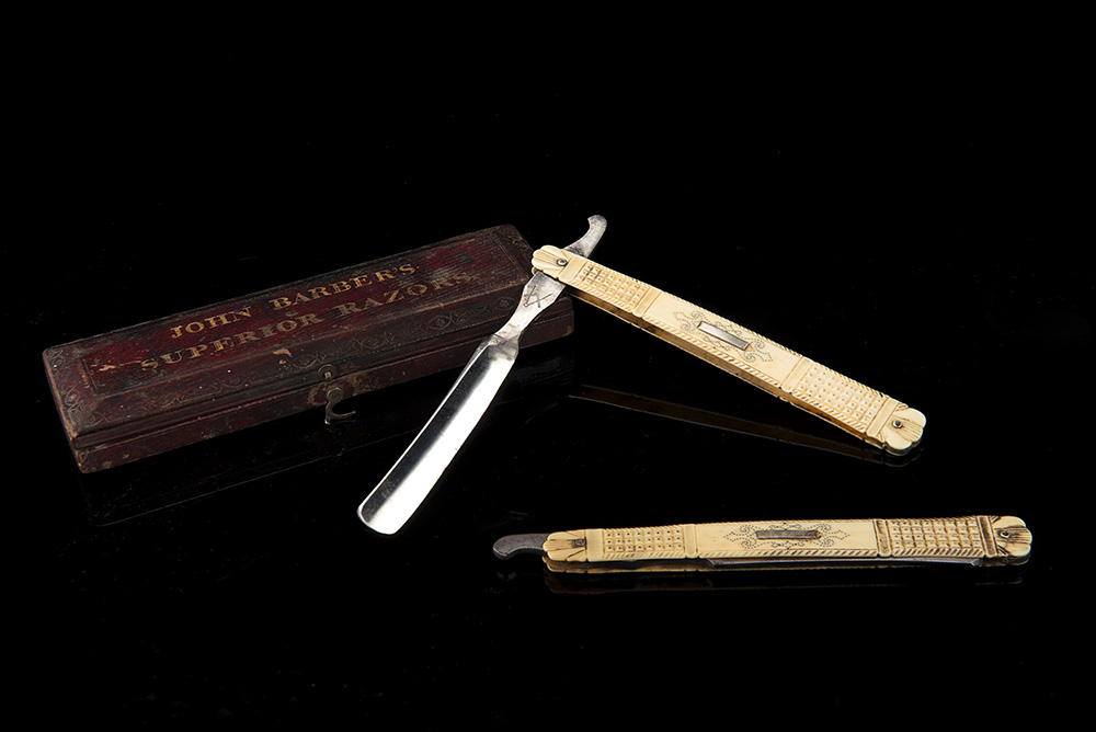 Astuccio foderato in marocchino contenente due rasoi in osso e acciaio. Lame marcate con simboli massonici. Iscrizione impressa in oro sull'astuccio "JOHN BARBER'S SUPERIOR RAZORS" A leather case containing two bone and steel razors. Each blade with engraved Masonic symbols. Case with inscription "JOHN BARBER'S SUPERIOR RAZORS"