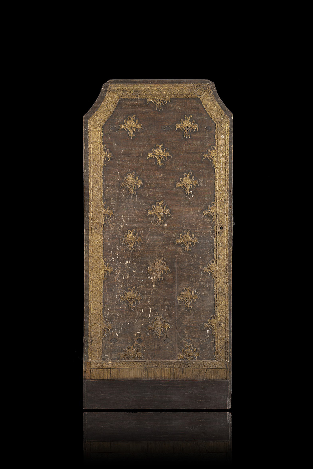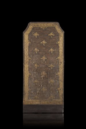 Porta ad un'anta in legno di forma sagomata, decorata in pastiglia a mazzi fioriti e motivi concatenati sul bordo. Sec XVIII (cm 207x94) (difetti e mancanze) A parcel-gilt wood door. 18th century (defects and losses)