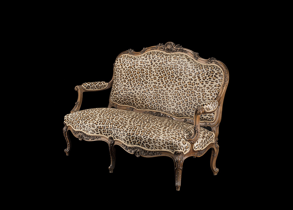 Divano in mogano con schienale e braccioli mossi ed intagliati a volute, foglie e fiori. Fascia decorata a motivi vegetali poggiante su piedi sagomati. Rivestito in cavallino stampato A mahogany sofa