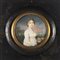 Maestro inizio sec. XIX "Ritratto di donna con mandolino" miniatura tonda su avorio (d. cm 6,5) In cornice in metallo (livei difetti) Early 19th-century master "Lady with mandolin" miniature on ivory (d. cm 6,5) Framed (minor defects)