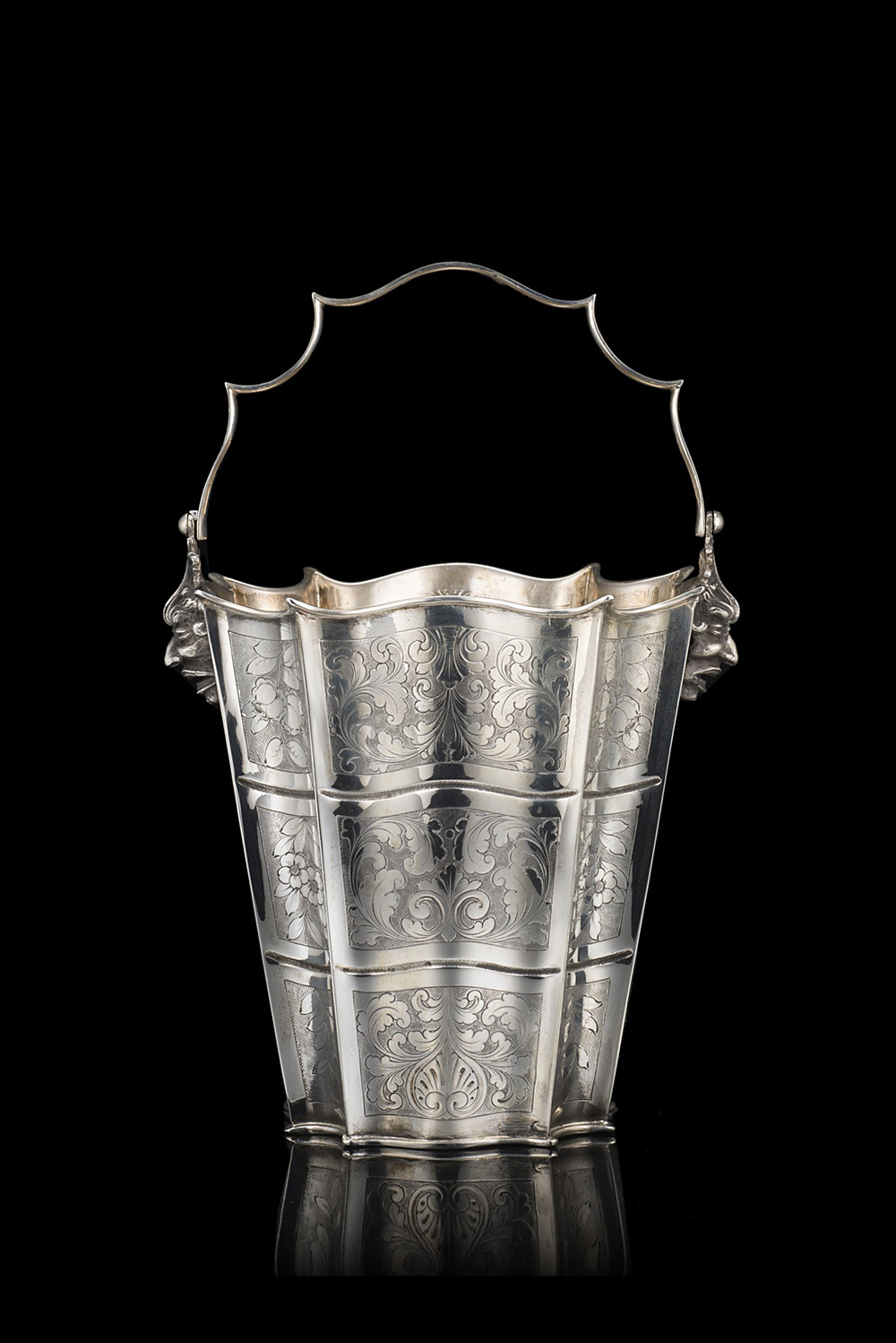 Secchiello portabottiglie in argento di sezione quadrata mistilinea e forma svasata, decorato con fasce di motivi fogliacei cesellati su fondo zigrinato e attacchi del manico in figura di mascheroni. Marchi del Fascio, Milano anni '30/'40 (h cm 21,5; largh. max cm 24) (gr 1500 ca.) (lievi difetti) A silver bucket. Milan, 1930s-40s. Fascio hallmark (h cm 21,5 ; l. max cm 24) (gr 1500 ca) (minor defects)