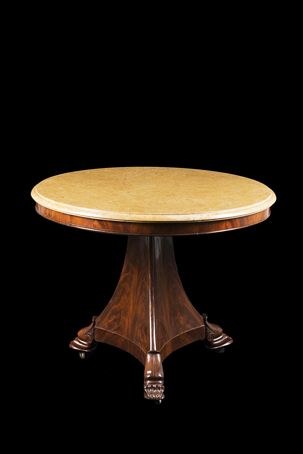 Tavolo da centro di forma tonda in noce con gamba sfaccettata troncopiramidale terminante a piedi ferini muniti di rotelle. Piano in marmo. Francia, sec. XIX (d. cm 95x h. cm 73) A walnut centre table with marble top. France, 19th century (d. cm 95 x h. cm 73)