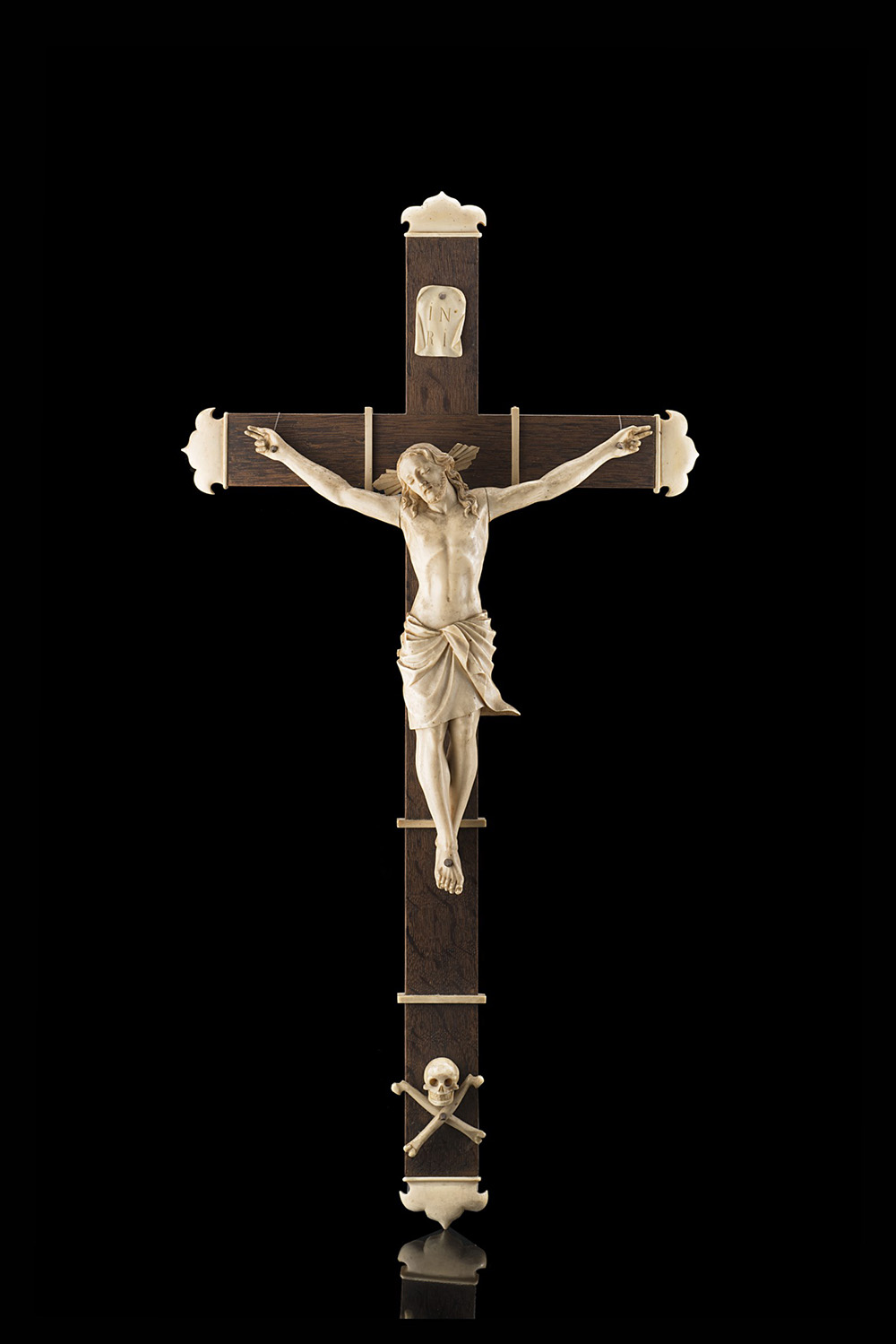 Arte del sec. XIX "Cristo Crocifisso" scultura in avorio (cm 30) montata su croce in legno con puntali e fregi in avorio 19th-century art "Crucified Christ" ivory sculpture (cm 30) on ivory and wood cross