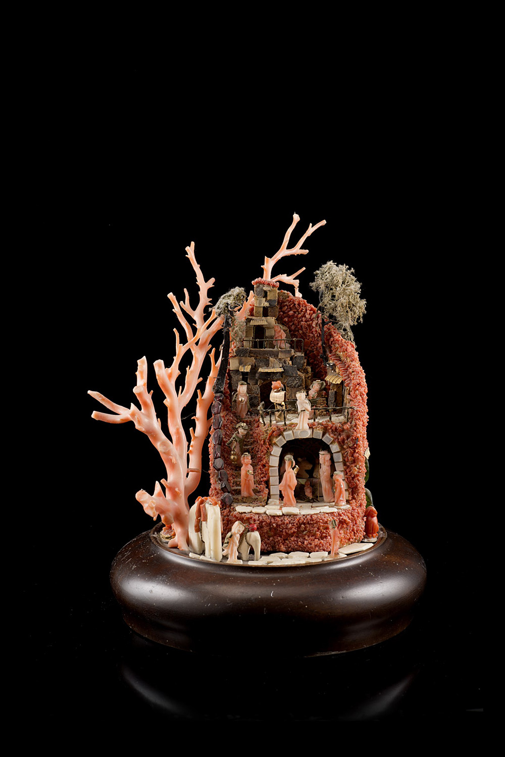 Piccolo presepe con elementi in corallo rosa, pietre dure e altri materiali....