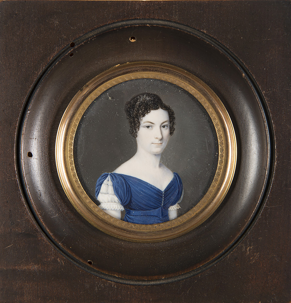Maestro del sec. XIX "Ritratto di donna in abito blu" miniatura tonda su...