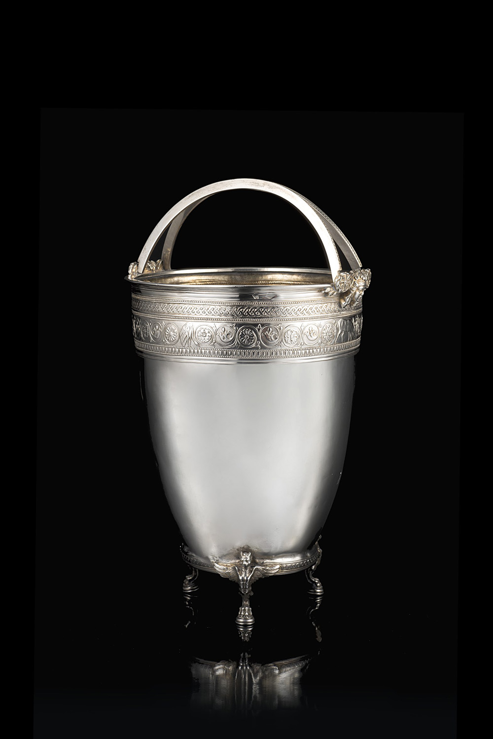 Secchiello in argento con manici, in stile neoclassico, con corpo liscio, decorato nella parte superiore con fasce a motivi vegetali, stilizzati, figure fantastiche e teste muliebri. Tre piedini in figura di animale fantastico. Italia, fine sec. XIX- inizi sec. XX (h. cm 27; d. cm 16) (gr 830 ca.) (lievi difetti) A silver bucket. Italy, end 19th -beginning 20th century (h cm 27; d cm 16) (gr 830 ca.) (minor defects)
