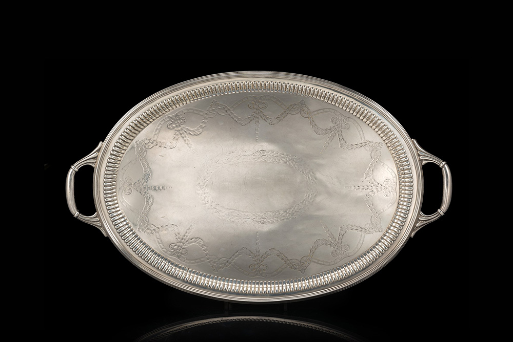 Vassoio in argento di forma ovale, a due manici, con fasce di ghirlande incise sul fondo, cavetto baccellato e bordura modanata. Londra, 1888. Argentiere Joseph & Horace Savory (cm 64,5X39,5 ca.) (gr 2680 ca.) (difetti) A silver tray. London, 1888. Silversmith Joseph & Horace Savory (cm 64,5x39,5) (gr 2680 ca) (defects)