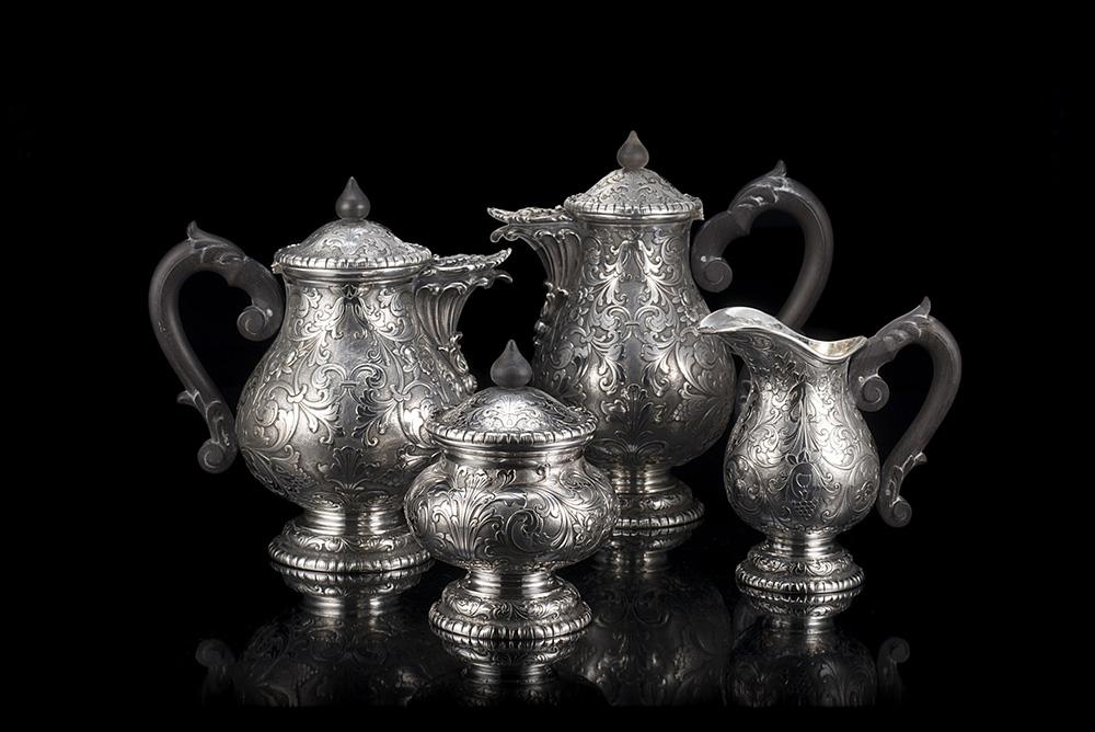 Servizio da tË e caffË in argento composto da caffettiera, teiera, zuccheriera e lattiera, con corpi piriformi cesellati a girali fogliati e fiori su sfondo zigrinato, e beccucci con volute e foglie; manici ad ansa sagomata e cimature a trottola in legno ebanizzato. Milano, anni '30/'40 marchi del Fascio (h. max cm 22) (gr lordi 1340 ca.) (lievi difetti) A silver service comprising a coffee pot, a tea pot, a sugar bowl and a milk jug. Milan, 1930s-40s. Fascio hallmark (h max cm 22) (grosse weight gr 1340 ca) (minor defects)