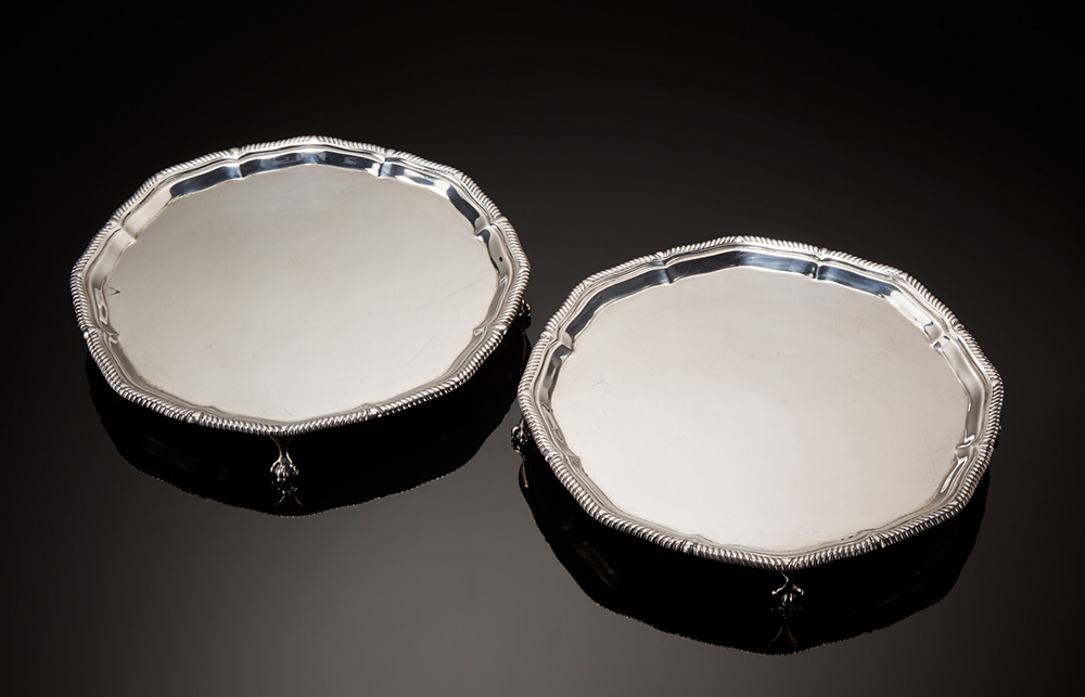 Coppia di salver in argento a fondo liscio con cavetto sagomato, bordo godronato, piedini ad artiglio. Argentiere Goldsmiths & Silversmiths Company. Londra, 1916 (d cm 20) (gr 760 ca.) (lievi difetti)