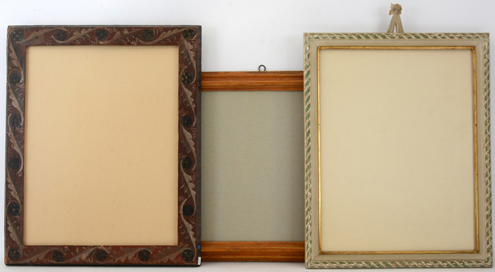 Lotto di tre cornici in legno laccato di differenti decori (luci cm 50x34,5, cm 34,5x44,5 e 34,5x44) (difetti)