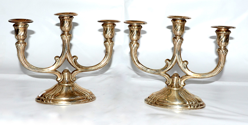 Coppia di candelabri in argento a tre fiamme con base di forma ovale, bracci...