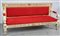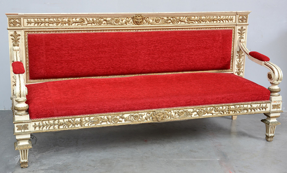 Divano in legno laccato e dorato, intagliato a racemi, motivi floreali e mascheroni, seduta e schienale rivestiti in tessuto rosso, sec XIX (difetti e piccole mancanze)