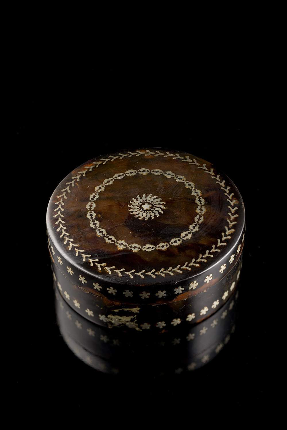 Tabacchiera in tartaruga intarsiata in argento a motivi stilizzati. Francia, sec. XIX (d. cm 8) (difetti)