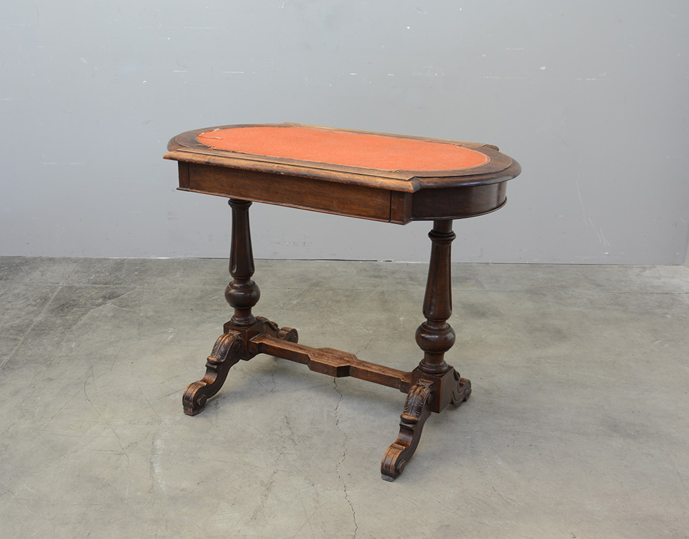 Tavolino da centro di forma sagomata in noce ad un cassetto nella fascia. Gambe tornite riunite da traversa terminanti con piedi sagomati. Sec. XIX (cm 101x76x60)(difetti)