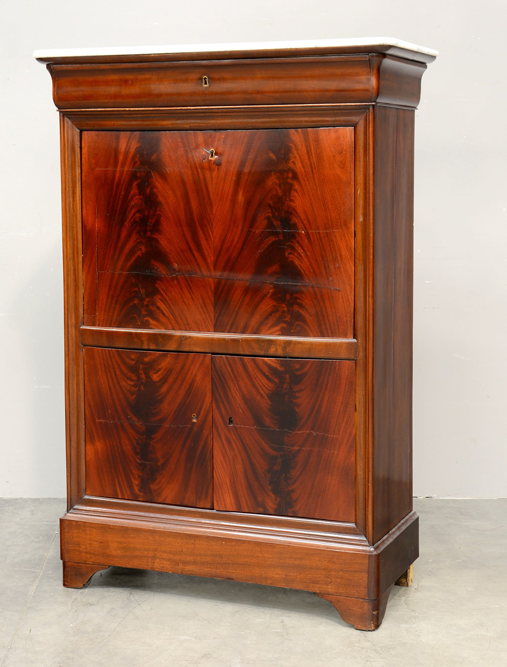 Secretaire in mogano e piuma di mogano a un cassetto sottopiano, due sportelli e anta ribaltabile celante cassettini. Piano in marmo, piedi sagomati. Sec XIX (difetti) (cm 105x156x50)