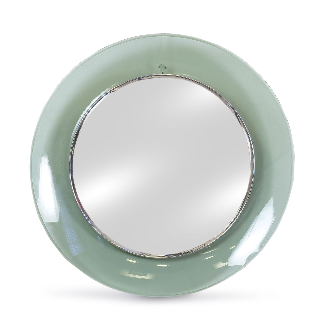 INGRAND MAX - Specchiera con cornice in vetro colorato e curvato, montatura in ottone cromato. Prod. Fontana Arte. cm 71. Bibl.: Laura Falconi, "Fontana arte. Una storia trasparente", Skira. 1998, pag. 153.