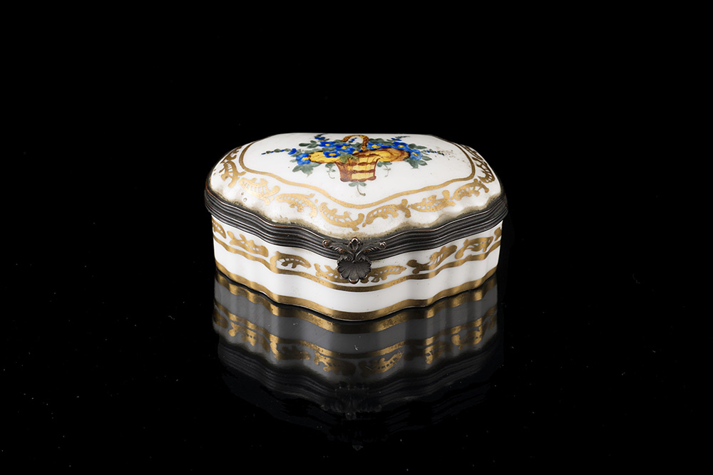 Manifattura di SËvres inizio sec. XIX. Scatola in porcellana decorata nel coperchio a cesto con fiori. Fascia e bordura a volute dorate (cm 8x4x5,5)